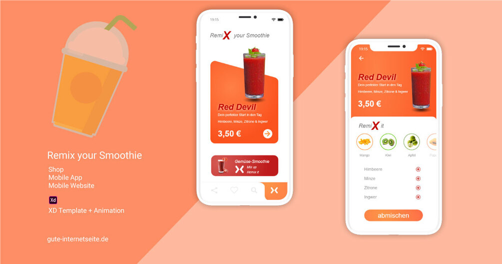 Du kannst diese Vorlage App Design Remix your Smoothie für Adobe XD als Inspiration für deine mobile Website oder App nutzen.