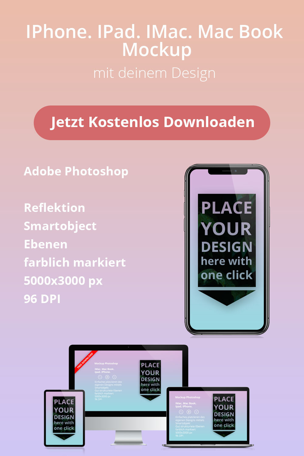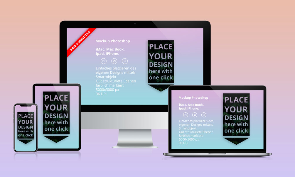 Mockup mit den Apple Geräten iPhone, iPad, Mac Book und iMac. Die Geräte sind einzeln auf verschiedenen Ebenen in der Photoshop Datei eingebunden und können auch einzeln verwendet werden.